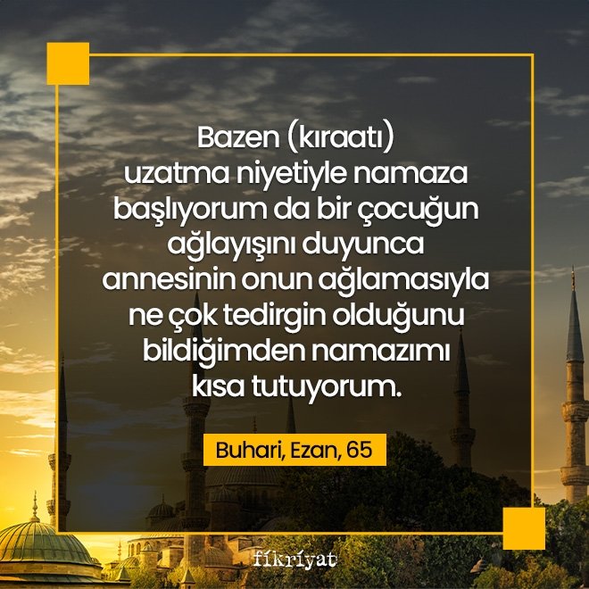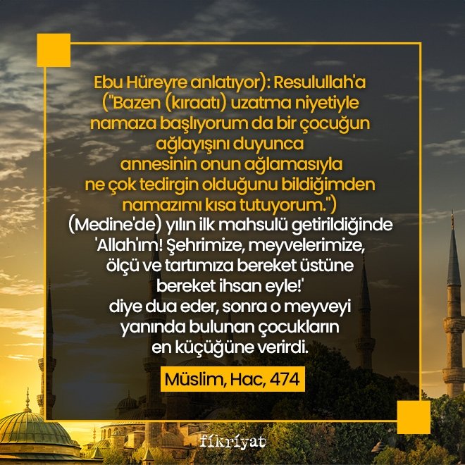 "(Ebu Hüreyre anlatıyor): Resulullah'a ("Bazen (kıraatı) uzatma niyetiyle namaza başlıyorum da bir çocuğun ağlayışını duyunca 40 hadiste Çocuk 20 annesinin onun ağlamasıyla ne çok tedirgin olduğunu bildiğimden namazımı kısa tutuyorum.") (Medine'de) yılın ilk mahsulü getirildiğinde 'Allah'ım! Şehrimize, meyvelerimize, ölçü ve tartımıza bereket üstüne bereket ihsan eyle!' diye dua eder, sonra o meyveyi yanında bulunan çocukların en küçüğüne verirdi."