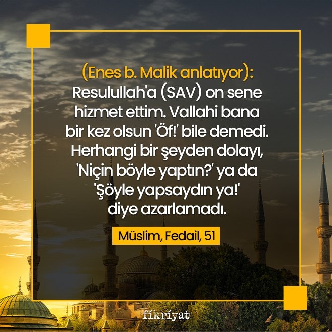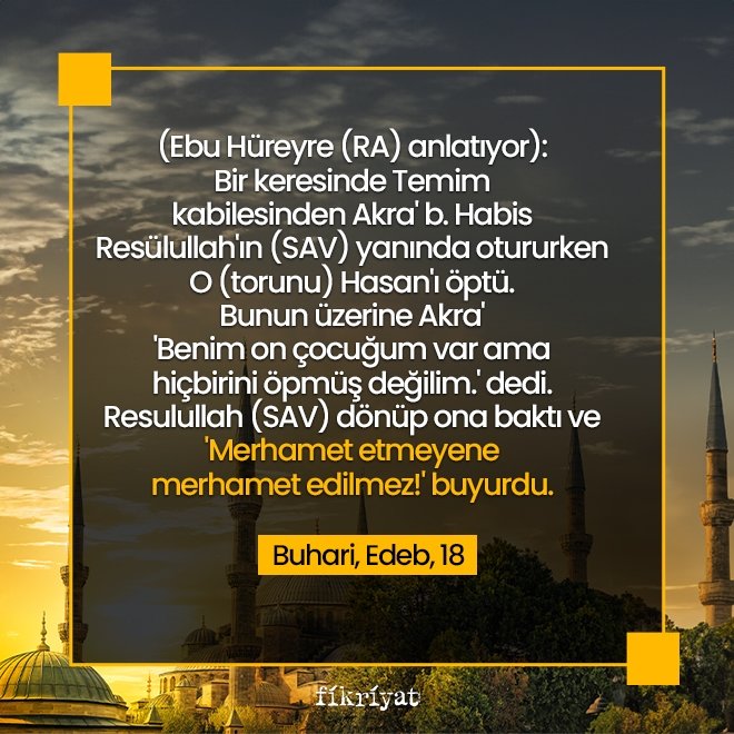 "(Ebu Hüreyre (RA) anlatıyor): Bir keresinde Temim kabilesinden Akra' b. Habis Resülullah'ın (SAV) yanında otururken O (torunu) Hasan'ı öptü. Bunun üzerine Akra' 'Benim on çocuğum var ama hiçbirini öpmüş değilim.' dedi. Resulullah (SAV) dönüp ona baktı ve 'Merhamet etmeyene merhamet edilmez!' buyurdu."