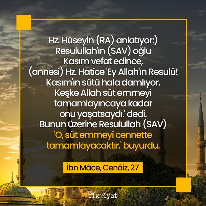"(Hz. Hüseyin (RA) anlatıyor:) Resulullah'ın (SAV) oğlu Kasım vefat edince, (annesi) Hz. Hatice 'Ey Allah'ın Resulü! Kasım'ın sütü hala damlıyor. Keşke Allah süt emmeyi tamamlayıncaya kadar onu yaşatsaydı.' dedi. Bunun üzerine Resulullah (SAV) 'O, süt emmeyi cennette tamamlayacaktır.' buyurdu."