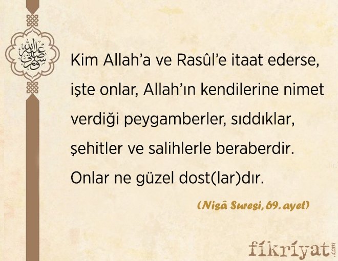 "Kim Allah'a ve Rasûl'e itaat ederse, işte onlar, Allah'ın kendilerine nimet verdiği peygamberler, sıddıklar, şehitler ve salihlerle beraberdir. Onlar ne güzel dost(lar)dır."