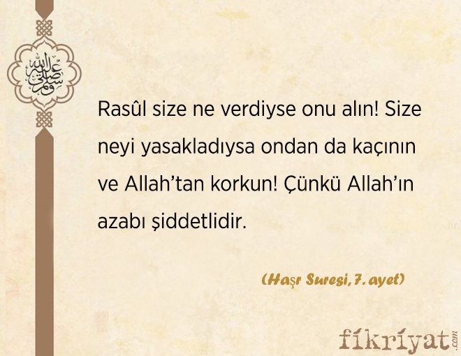"…Rasûl size ne verdiyse onu alın! Size neyi yasakladıysa ondan da kaçının ve Allah'tan korkun! Çünkü Allah'ın azabı şiddetlidir."