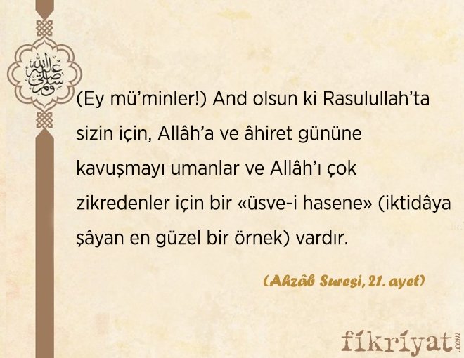"(Ey mü'minler!) And olsun ki Rasulullah'ta sizin için, Allâh'a ve âhiret gününe kavuşmayı umanlar ve Allâh'ı çok zikredenler için bir «üsve-i hasene» (iktidâya şâyan en güzel bir örnek) vardır."