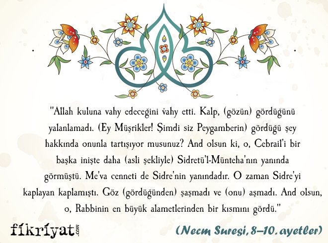 "Allah kuluna vahy edeceğini vahy etti. Kalp, (gözün) gördüğünü yalanlamadı. (Ey Müşrikler! Şimdi siz Peygamberin) gördüğü şey hakkında onunla tartışıyor musunuz? And olsun ki, o, Cebrail'i bir başka inişte daha (asli şekliyle) Sidretü'l-Münteha'nın yanında görmüştü. Me'va cenneti de Sidre'nin yanındadır. O zaman Sidre'yi kaplayan kaplamıştı. Göz (gördüğünden) şaşmadı ve (onu) aşmadı. And olsun, o, Rabbinin en büyük alametlerinden bir kısmını gördü."