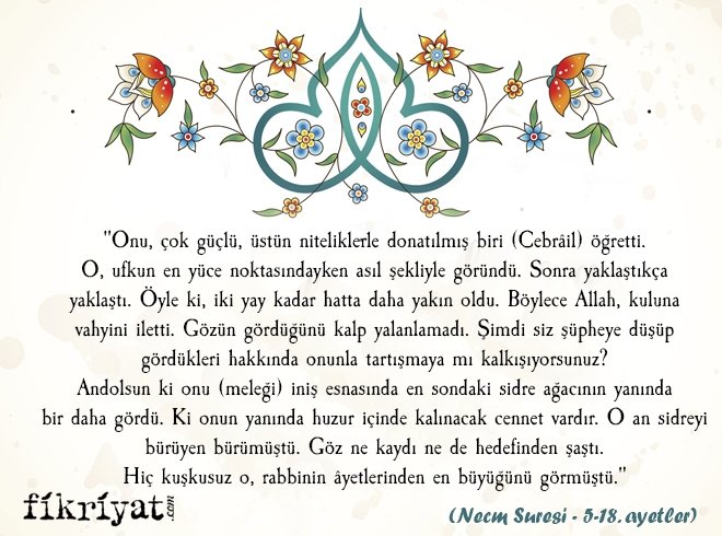 "Onu, çok güçlü, üstün niteliklerle donatılmış biri (Cebrâil) öğretti. O, ufkun en yüce noktasındayken asıl şekliyle göründü. Sonra yaklaştıkça yaklaştı. Öyle ki, iki yay kadar hatta daha yakın oldu. Böylece Allah, kuluna vahyini iletti. Gözün gördüğünü kalp yalanlamadı. Şimdi siz şüpheye düşüp gördükleri hakkında onunla tartışmaya mı kalkışıyorsunuz? Andolsun ki onu (meleği) iniş esnasında en sondaki sidre ağacının yanında bir daha gördü. Ki onun yanında huzur içinde kalınacak cennet vardır. O an sidreyi bürüyen bürümüştü. Göz ne kaydı ne de hedefinden şaştı. Hiç kuşkusuz o, rabbinin âyetlerinden en büyüğünü görmüştü."