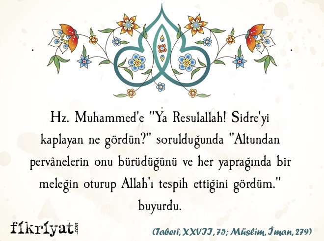 Hz. Muhammed'e "Yâ Resulallah! Sidre'yi kaplayan ne gördün?" sorulduğunda "Altundan pervânelerin onu bürüdüğünü ve her yaprağında bir meleğin oturup Allâh'ı tespih ettiğini gördüm." dediği rivayet edilir. (Taberî, XXVII, 75; Müslim, Îman, 279)