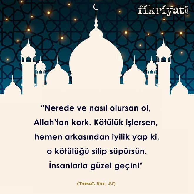 📌 Ebu Zer Cündeb İbni Cünade ve Ebu Abdurrahman Muaz İbni Cebel den (ra) rivayet edildiğine göre Rasulullah (sav) şöyle buyurdu: "Nerede ve nasıl olursan ol, Allah'tan kork. Kötülük işlersen, hemen arkasından iyilik yap ki, o kötülüğü silip süpürsün. İnsanlarla güzel geçin!" (x) (Tirmizî, Birr, 55)