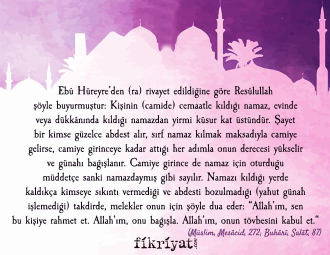 Ebû Hüreyre'den (ra) rivayet edildiğine göre Resûlullah şöyle buyurmuştur: Kişinin (camide) cemaatle kıldığı namaz, evinde veya dükkânında kıldığı namazdan yirmi küsur kat üstündür. Şayet bir kimse güzelce abdest alır, sırf namaz kılmak maksadıyla camiye gelirse, camiye girinceye kadar attığı her adımla onun derecesi yükselir ve günahı bağışlanır. Camiye girince de namaz için oturduğu müddetçe sanki namazdaymış gibi sayılır. Namazı kıldığı yerde kaldıkça kimseye sıkıntı vermediği ve abdesti bozulmadığı (yahut günah işlemediği) takdirde, melekler onun için şöyle dua eder: "Allah'ım, sen bu kişiye rahmet et. Allah'ım, onu bağışla. Allah'ım, onun tövbesini kabul et.