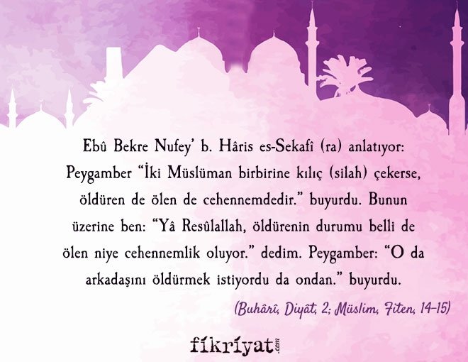 Ebû Bekre Nufey' b. Hâris es-Sekafî (ra) anlatıyor: Peygamber :"İki Müslüman birbirine kılıç (silah) çekerse, öldüren de ölen de cehennemdedir." buyurdu. Bunun üzerine ben: "Yâ Resûlallah, öldürenin durumu belli de, ölen niye cehennemlik oluyor." dedim. Peygamber: "O da arkadaşını öldürmek istiyordu da ondan." buyurdu.