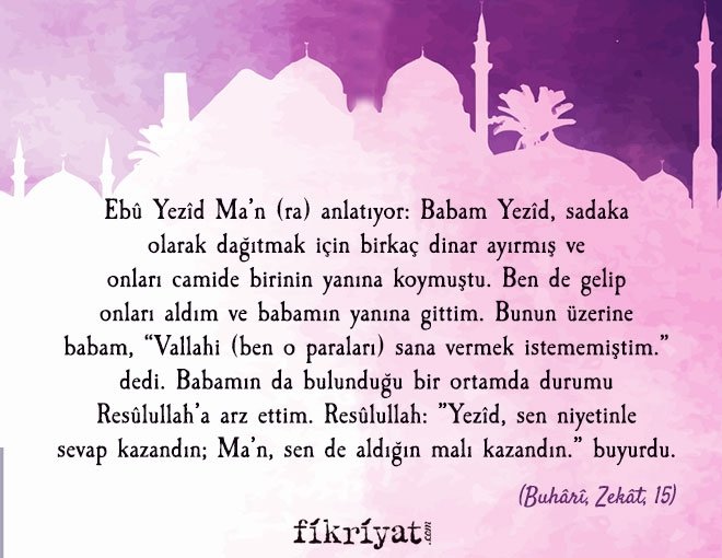 Ebû Yezîd Ma'n (ra) anlatıyor: Babam Yezîd, sadaka olarak dağıtmak için birkaç dinar ayırmış ve onları camide birinin yanına koymuştu. Ben de gelip onları aldım ve babamın yanına gittim. Bunun üzerine babam, "Vallahi (ben o paraları) sana vermek istememiştim." dedi. Babamın da bulunduğu bir ortamda durumu Resûlullah'a arz ettim. Resûlullah: Yezîd, sen niyetinle sevap kazandın; Ma'n, sen de aldığın malı kazandın, buyurdu.