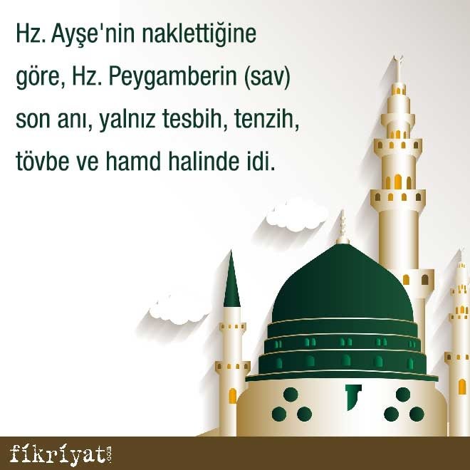 ◽ Hz. Ayşe'ni naklettiğine göre, Hz. Peygamberin (sav) son anı, yalnız tesbih, tenzih, tövbe ve hamd halinde idi. Sık sık: