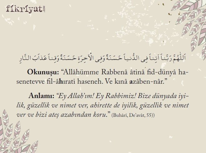Anlamı: "Ey Allah'ım! Ey Rabbimiz! Bize dünyada iyilik, güzellik ve nimet ver, ahirette de iyilik, güzellik ve nimet ver ve bizi ateş azabından koru."