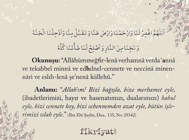 Anlamı: "Allah'ım! Bizi bağışla, bize merhamet eyle, (ibadetlerimizi, hayır ve hasenatımızı, dualarımızı) kabul eyle, bizi cennete koy, bizi cehennemden azat eyle, bütün işlerimizi ıslah eyle."