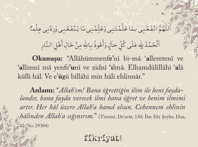 Anlamı: "Allah'ım! Bana öğrettiğin ilim ile beni faydalandır, bana fayda verecek ilmi bana öğret ve benim ilmimi artır. Her hâl üzere Allah'a hamd olsun. Cehennem ehlinin hâlinden Allah'a sığınırım."