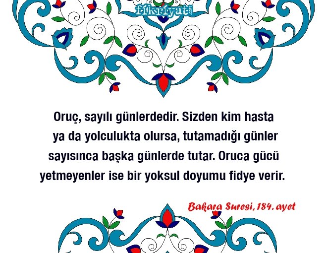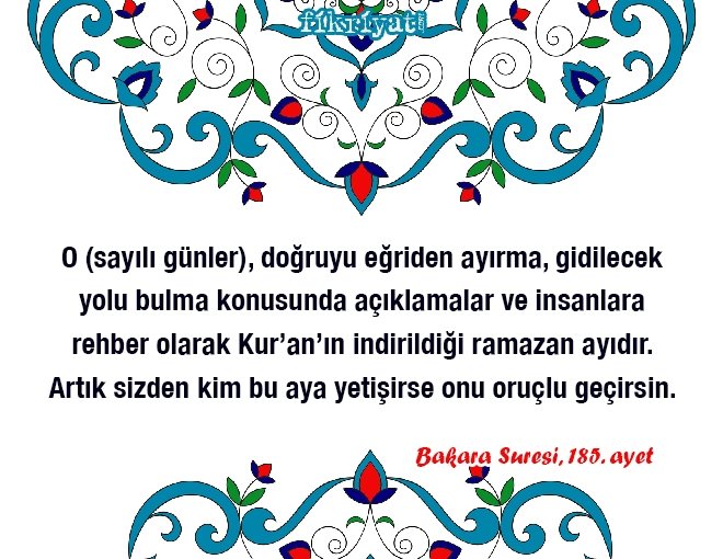 O (sayılı günler), doğruyu eğriden ayırma, gidilecek yolu bulma konusunda açıklamalar ve insanlara rehber olarak Kur'an'ın indirildiği ramazan ayıdır. Artık sizden kim bu aya yetişirse onu oruçlu geçirsin. Kim de hasta veya yolcu olursa, başka günlerden sayısınca tutar. Allah sizin için kolaylık istiyor güçlük çekmenizi istemiyor. Sayıyı tamamlamanız, sizi doğru yola iletmesine karşı Allah'ın ululuğunu dile getirmeniz ve umulur ki şükredersiniz diye (uygun hükümler gönderiyor).