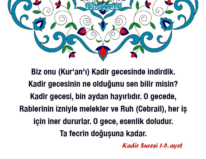 Biz onu (Kur'an'ı) Kadir gecesinde indirdik. Kadir gecesinin ne olduğunu sen bilir misin? Kadir gecesi, bin aydan hayırlıdır. O gecede, Rablerinin izniyle melekler ve Ruh (Cebrail), her iş için iner dururlar. O gece, esenlik doludur. Ta fecrin doğuşuna kadar.