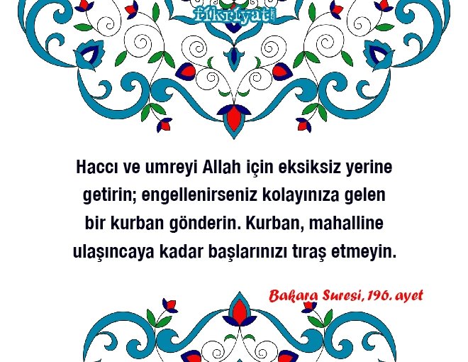 Haccı ve umreyi Allah için eksiksiz yerine getirin; engellenirseniz kolayınıza gelen bir kurban gönderin. Kurban, mahalline ulaşıncaya kadar başlarınızı tıraş etmeyin. Fakat içinizden biri hasta ise veya başından bir rahatsızlığı varsa (tıraşını olup) oruç veya sadaka yahut kurban olarak bir fidye ödesin. Güvenlikte olduğunuzda hacdan önce umre yapan kişi, gücünün elverdiği türden bir kurban kessin. Bulamayan ise hac sırasında üç gün, döndükten sonra da yedi gün yani tam on gün oruç tutmalıdır. Bu, ailesi Mescid-i Harâm civarında oturmayanlar içindir. Allah'ın buyruğuna saygılı olun ve bilin ki Allah'ın cezalandırması çok şiddetlidir.