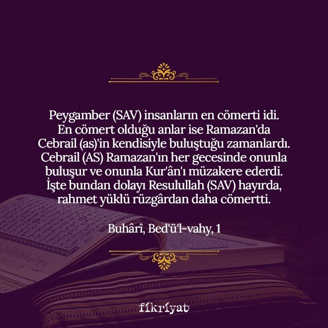 "Peygamber (SAV) insanların en cömerti idi. En cömert olduğu anlar ise Ramazan'da Cebrail (AS)'in kendisiyle buluştuğu zamanlardı. Cebrail (AS) Ramazan'ın her gecesinde onunla buluşur ve onunla Kur'ân'ı müzakere ederdi. İşte bundan dolayı Resulullah (SAV) hayırda, rahmet yüklü rüzgârdan daha cömertti."