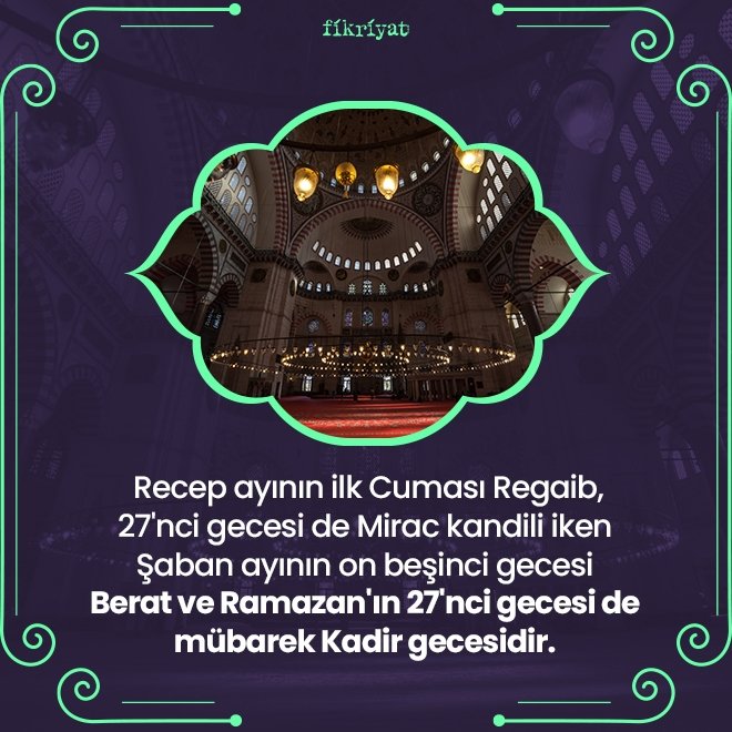 🔹 Recep ayının ilk Cuması Regaib, 27'nci gecesi de Mirac kandili iken Şaban ayının on beşinci gecesi Berat gecesi ve Ramazan'ın 27'nci gecesi de mübarek Kadir gecesidir.