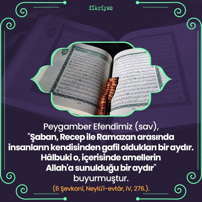 🔹 Öyle ki Peygamber Efendimiz (sav), "Şaban, Recep ile Ramazan arasında insanların kendisinden gafil oldukları bir aydır. Hâlbuki o, içerisinde amellerin Allah'a sunulduğu bir aydır" buyurmuştur (6 Şevkanî, Neylü'l-evtâr, IV, 276.).