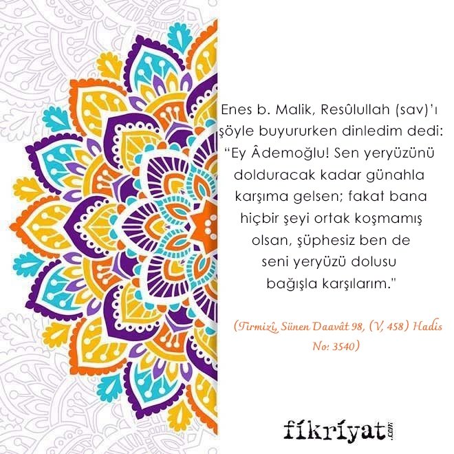Enes b. Malik (ra) Resûlullah (sav) şöyle buyururken dinledim dedi: "Allah Teâlâ şöyle buyurdu: Ey Âdemoğlu! Sen bana dua ettiğin ve benden affını umduğun sürece, işlediğin günahlar ne kadar çok olursa olsun, onların büyüklüğüne bakmadan seni bağışlarım. Ey Âdemoğlu! Günahların gökyüzünü kaplayacak kadar çok olsa, sonra da benden affını dilesen, seni affederim. Ey Âdemoğlu! Sen yeryüzünü dolduracak kadar günahla karşıma gelsen; fakat bana hiçbir şeyi ortak koşmamış olsan, şüphesiz ben de seni yeryüzü dolusu bağışla karşılarım."