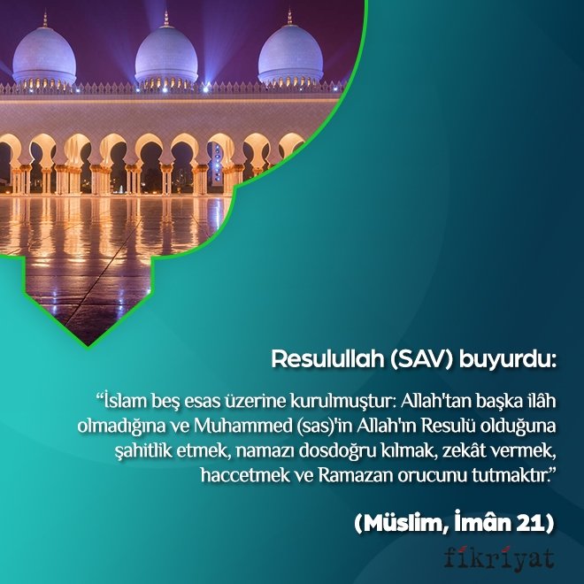 "İslam beş esas üzerine kurulmuştur: Allah'tan başka ilâh olmadığına ve Muhammed (sas)'in Allah'ın Resulü olduğuna şahitlik etmek, namazı dosdoğru kılmak, zekât vermek, haccetmek ve Ramazan orucunu tutmaktır."