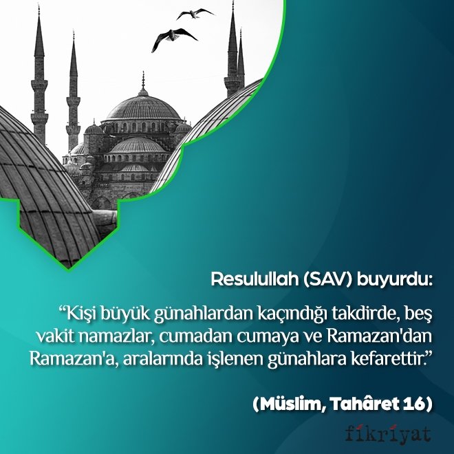 "Kişi büyük günahlardan kaçındığı takdirde, beş vakit namazlar, cumadan cumaya ve Ramazan'dan Ramazan'a, aralarında işlenen günahlara kefarettir."