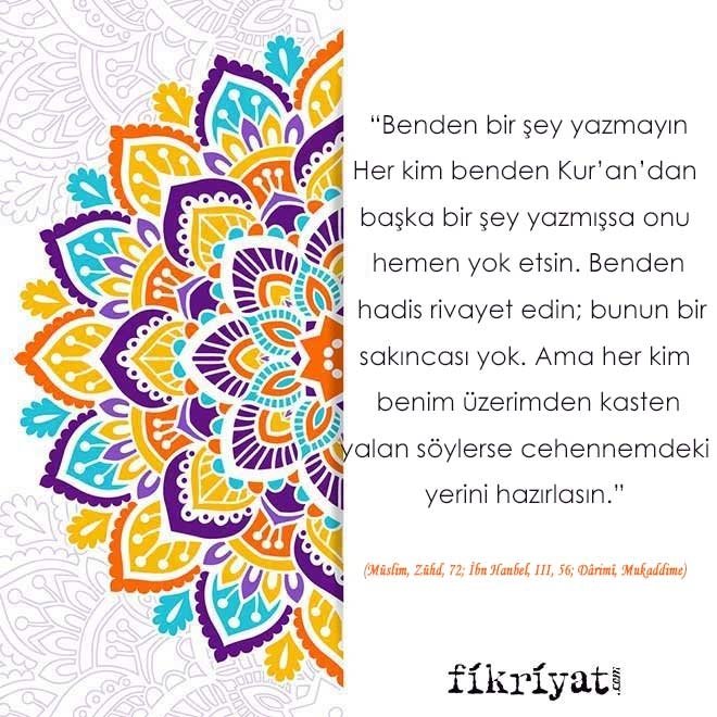 📌Hadis, Peygamber Efendimizin (sav) Kur'an-ı Kerim dışındaki söz ve davranışlarıdır. Fakat bunlar yazıya geçirilmemiştir. Hem dönemin şartları bu duruma müsait değildi hem de Allah Resulü hoş karşılamamıştı. Ebû Saîd el-Hudrî vasıtasıyla nakledildiğine göre Resûlullah şöyle demiştir: "Benden bir şey yazmayın. Her kim benden Kur'an'dan başka bir şey yazmışsa onu hemen yok etsin. Benden hadis rivayet edin; bunun bir sakıncası yok. Ama her kim benim üzerimden kasten yalan söylerse cehennemdeki yerini hazırlasın." (Müslim, Zühd, 72; İbn Hanbel, III, 56; Dârimî, Mukaddime)