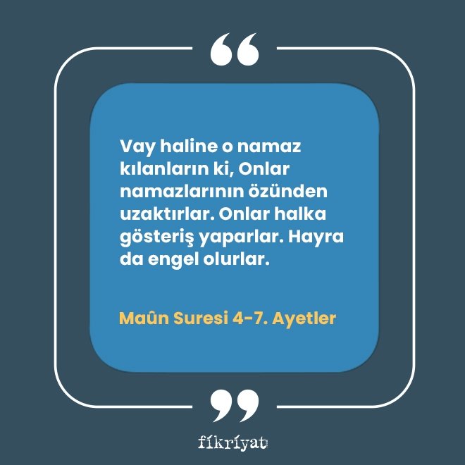 "Vay haline o namaz kılanların ki, Onlar namazlarının özünden uzaktırlar. Onlar halka gösteriş yaparlar. Hayra da engel olurlar."
