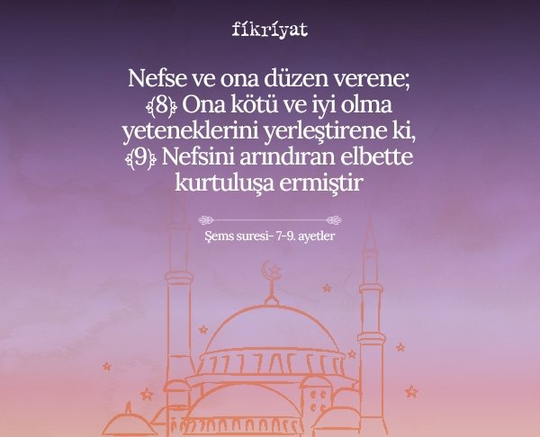 Nefse ve ona düzen verene; ﴾8﴿ Ona kötü ve iyi olma yeteneklerini yerleştirene ki, ﴾9﴿ Nefsini arındıran elbette kurtuluşa ermiştir.