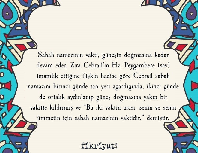 Sabah namazının vakti, güneşin doğmasına kadar devam eder. Zira Cebrail'in Hz. Peygambere (sav) imamlık ettiğine ilişkin hadise göre Cebrail sabah namazını birinci günde tan yeri ağardığında, ikinci günde de ortalık aydınlanıp güneş doğmasına yakın bir vakitte kıldırmış ve "Bu iki vaktin arası, senin ve senin ümmetin için sabah namazının vaktidir." (Tirmizî, Salât, 1; Nesâî, Mevâkit, 5,9; Muvatta, Vükût, 3) demiştir.
