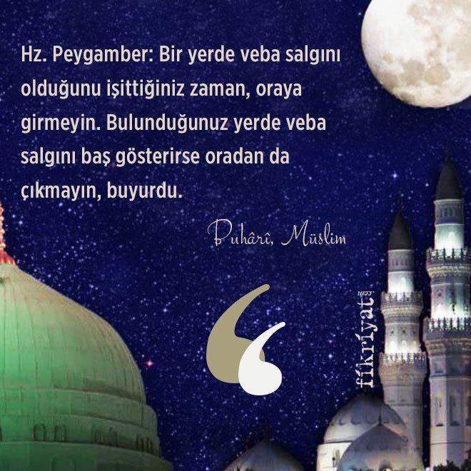 💠 Bir yerde veba salgını olduğunu işittiğiniz zaman, oraya girmeyin. Bulunduğunuz yerde veba salgını baş gösterirse oradan da çıkmayın, buyurdu.