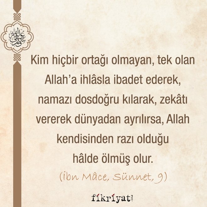 Kim hiçbir ortağı olmayan, tek olan Allah'a ihlâsla ibadet ederek, namazı dosdoğru kılarak, zekâtı vererek dünyadan ayrılırsa, Allah kendisinden razı olduğu hâlde ölmüş olur.