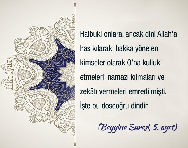Halbuki onlara, ancak dini Allah'a has kılarak, hakka yönelen kimseler olarak O'na kulluk etmeleri, namazı kılmaları ve zekâtı vermeleri emredilmişti. İşte bu dosdoğru dindir.