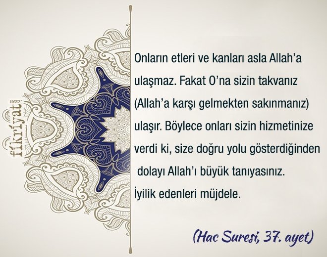 Onların etleri ve kanları asla Allah'a ulaşmaz. Fakat O'na sizin takvanız (Allah'a karşı gelmekten sakınmanız) ulaşır. Böylece onları sizin hizmetinize verdi ki, size doğru yolu gösterdiğinden dolayı Allah'ı büyük tanıyasınız. İyilik edenleri müjdele.