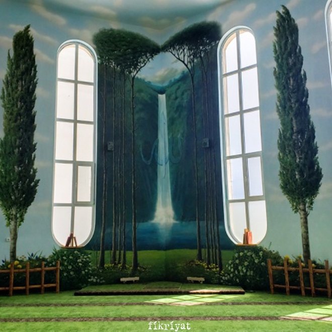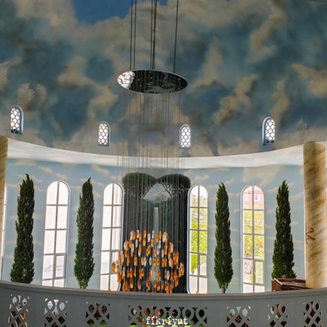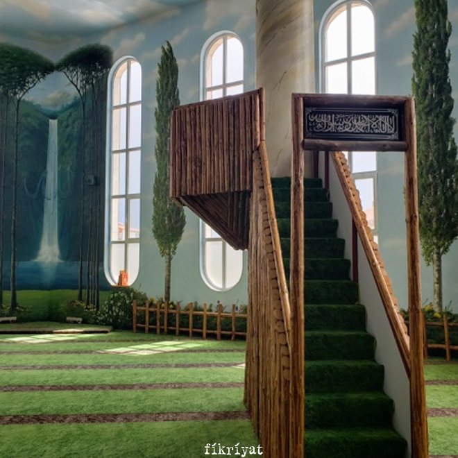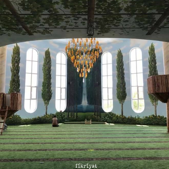 ◾ Duvarları kavak ağaçları ve çiçeklerle, kıblegahı şelale, tavanı gökyüzü figürüyle resmedilen, minberi ve etrafı çitle çevrili, zemininde çimen ve toprak görünümlü halıyla kaplı yedigen şekilli camide namaz kılanlar, hem doğayla iç içe ibadet etme hissine kapılıyor hem de gördükleri manzaraları fotoğraflıyor.