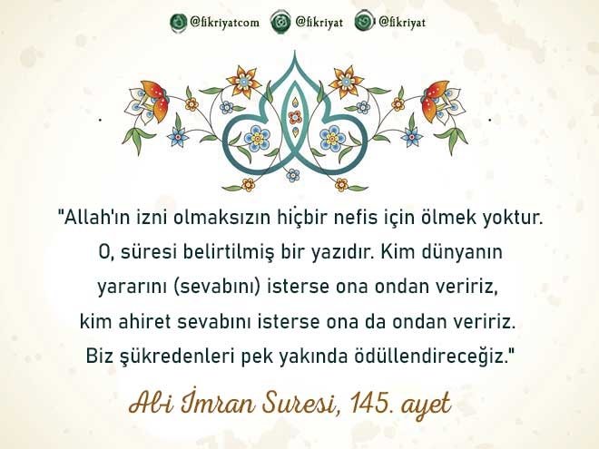 "Muhammed, yalnızca bir elçidir. Ondan önce nice elçiler gelip-geçmiştir. Şimdi O ölürse ya da öldürülürse, siz topuklarınız üzerinde gerisin geriye mi döneceksiniz? İki topuğu üzerinde gerisin geri dönen kimse, Allah'a kesinlikle zarar veremez. Allah, şükredenleri pek yakında ödüllendirecektir."