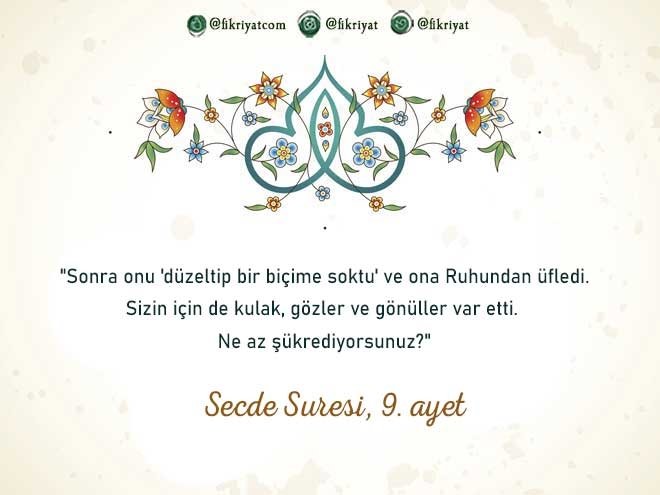 "Sonra onu 'düzeltip bir biçime soktu' ve ona Ruhundan üfledi. Sizin için de kulak, gözler ve gönüller var etti. Ne az şükrediyorsunuz?"