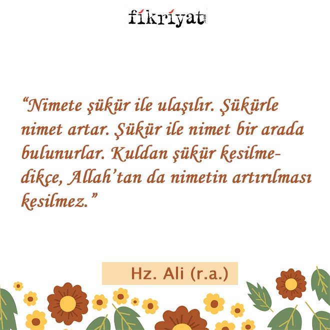 Verilen nimetlere şükretmek Müslümanların ahlaki özelliklerindendir.Şükür, insanın kendisine verilen nimetlere karşı Allah'a teşekkür etmesidir. Allah Kur'an-ı Kerim'de birçok ayette Müslümanların verilen nimetlere şükretmeleri gerektiğini belirtmiş, eğer şükrederlerse nimetini artıracağına dair söz vermiş ve şöyle buyurmuştur: "Rabbiniz şöyle buyurmuştu: "Andolsun, eğer şükrederseniz gerçekten size artırırım ve andolsun, eğer nankörlük ederseniz, şüphesiz, Benim azabım pek şiddetlidir." (İbrahim, 7) Bu sebeple Peygamber Efendimiz ve sahabiler şükür ve şükretmenin önemi üzerinde ziyadesiyle durmuştur.