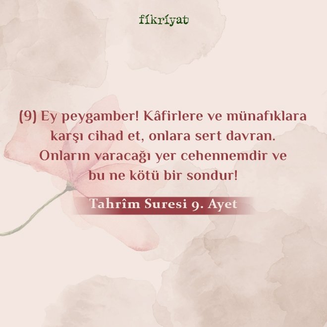Ey peygamber! Kâfirlere ve münafıklara karşı cihad et, onlara sert davran. Onların varacağı yer cehennemdir ve bu ne kötü bir sondur!