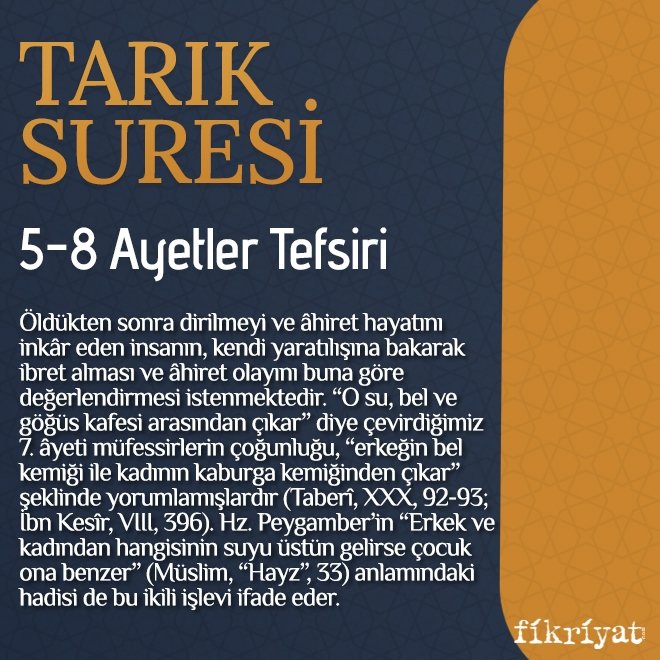 ➡ Öldükten sonra dirilmeyi ve âhiret hayatını inkâr eden insanın, kendi yaratılışına bakarak ibret alması ve âhiret olayını buna göre değerlendirmesi istenmektedir. "O su, bel ve göğüs kafesi arasından çıkar" diye çevirdiğimiz 7. âyeti müfessirlerin çoğunluğu, "erkeğin bel kemiği ile kadının kaburga kemiğinden çıkar" şeklinde yorumlamışlardır (Taberî, XXX, 92-93; İbn Kesîr, VIII, 396). Hz. Peygamber'in "Erkek ve kadından hangisinin suyu üstün gelirse çocuk ona benzer" (Müslim, "Hayz", 33) anlamındaki hadisi de bu ikili işlevi ifade eder.