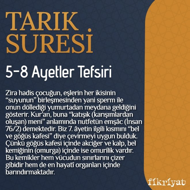 ➡ Öldükten sonra dirilmeyi ve âhiret hayatını inkâr eden insanın, kendi yaratılışına bakarak ibret alması ve âhiret olayını buna göre değerlendirmesi istenmektedir. "O su, bel ve göğüs kafesi arasından çıkar" diye çevirdiğimiz 7. âyeti müfessirlerin çoğunluğu, "erkeğin bel kemiği ile kadının kaburga kemiğinden çıkar" şeklinde yorumlamışlardır (Taberî, XXX, 92-93; İbn Kesîr, VIII, 396). Hz. Peygamber'in "Erkek ve kadından hangisinin suyu üstün gelirse çocuk ona benzer" (Müslim, "Hayz", 33) anlamındaki hadisi de bu ikili işlevi ifade eder.