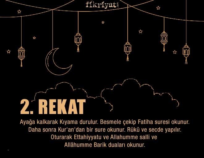 Cemaat halinde kılınan teravihin ikinci rekatında imam "besmele, Fatiha ve Kur'an'dan bir sure" okur. Ardından rükû ve secde yapılır ve tahiyyata oturulur. İki rekât şeklinde kılınacaksa imam ve cemaat "Tahiyyat duası, salli-barik dualarıyla rabbena duaları" okur ve selam verilir. Eğer 4'er rekât olarak kılınacaksa imam ve cemaat tahiyyat, salli ve barik dualarını okur sonra üçüncü rekâta kalkılır.