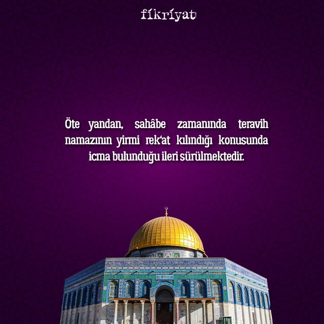 ▪ Öte yandan, sahâbe zamanında teravih namazının yirmi rek'at kılındığı konusunda icma bulunduğu ileri sürülmektedir. Mâlik, Muvatta adlı eserinde Hz. Ömer'in, Übey b. Kâ'b ile Temîm ed-Dârî'yi ramazanda cemaate 11 rek'at namaz kıldırmak üzere teravih imamı tayin ettiğini, imamın her rek'atta yaklaşık 100 âyet okuduğunu, kıyamın uzaması sebebiyle bir kısım cemaatin bastona dayanmak ihtiyacını hissettiğini ve fecrin doğmasına yakın bir zamanda evlere dağıldıklarını kaydetmiştir. Kimi bilginler teravih namazının 11 rek'at kılındığı rivayetinin yanlış olduğunu ileri sürerken, kimileri 11 rek'at kılma uygulamasının teravihin cemaatle kılınmaya başladığı ilk günlere ait olduğu, sonraları teravih namazının 20 olarak yerleştiği yorumunda bulunmuşlardır. Bu yorum, Hz. Peygamber'in 11 rek'at dışında gece namazı kılmadığı rivayetiyle uyumludur.
