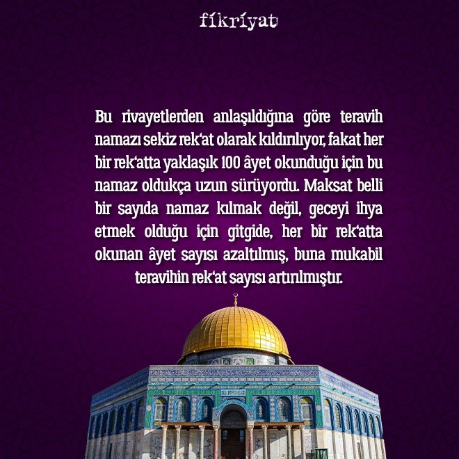 ▪ Bu rivayetlerden anlaşıldığına göre teravih namazı sekiz rek'at olarak kıldırılıyor, fakat her bir rek'atta yaklaşık 100 âyet okunduğu için bu namaz oldukça uzun sürüyordu. Maksat belli bir sayıda namaz kılmak değil, geceyi ihya etmek olduğu için gitgide, her bir rek'atta okunan âyet sayısı azaltılmış, buna mukabil teravihin rek'at sayısı artırılmıştır. Ömer'in uygulamasıyla bu sayı 20 olarak yerleşmiş, Hz. Osman ve Hz. Ali zamanında ve daha sonraları bu şekilde devam etmiştir. Gerek Sünnî gerek Şiî fıkıh mezhepleri içinde teravih namazının 20 rek'attan az olduğunu söyleyen bir mezhep yoktur.