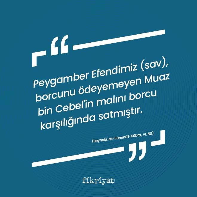 🔸 Peygamber Efendimiz (sav), borcunu ödeyemeyen Muaz bin Cebel'in malını borcu karşılığında satmıştır. (Beyhakî, es-Sünenü'l-Kübrâ, VI, 80)