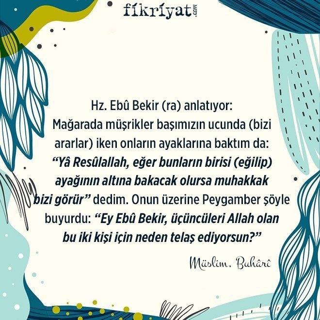 🔸 Mağarada müşrikler başımızın ucunda (bizi ararlar) iken onların ayaklarına baktım da: "Yâ Resûlallah, eğer bunların birisi (eğilip) ayağının altına bakacak olursa muhakkak bizi görür" dedim. Onun üzerine Peygamber şöyle buyurdu: "Ey Ebû Bekir, üçüncüleri Allah olan bu iki kişi için neden telaş ediyorsun?"
