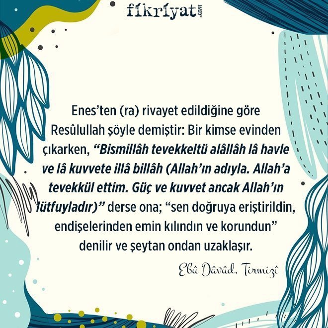🔸 Bir kimse evinden çıkarken, "Bismillâh tevekkeltü alâllâh lâ havle ve lâ kuvvete illâ billâh (Allah'ın adıyla. Allah'a tevekkül ettim. Güç ve kuvvet ancak Allah'ın lütfuyladır)" derse ona; "sen doğruya eriştirildin, endişelerinden emin kılındın ve korundun" denilir ve şeytan ondan uzaklaşır.