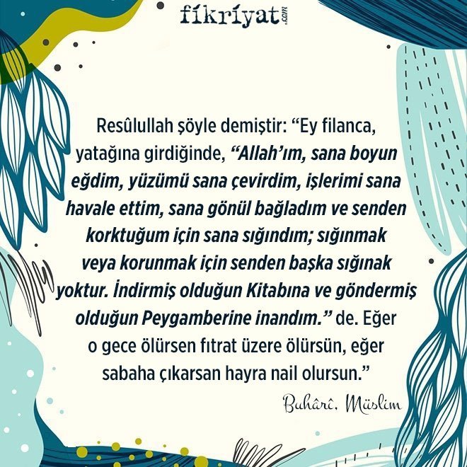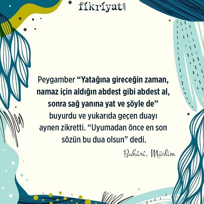 🔸 "Ey filanca, yatağına girdiğinde, "Allah'ım, sana boyun eğdim, yüzümü sana çevirdim, işlerimi sana havale ettim, sana gönül bağladım ve senden korktuğum için sana sığındım; sığınmak veya korunmak için senden başka sığınak yoktur. İndirmiş olduğun Kitabına ve göndermiş olduğun Peygamberine inandım." de. Eğer o gece ölürsen fıtrat üzere ölürsün, eğer sabaha çıkarsan hayra nail olursun."