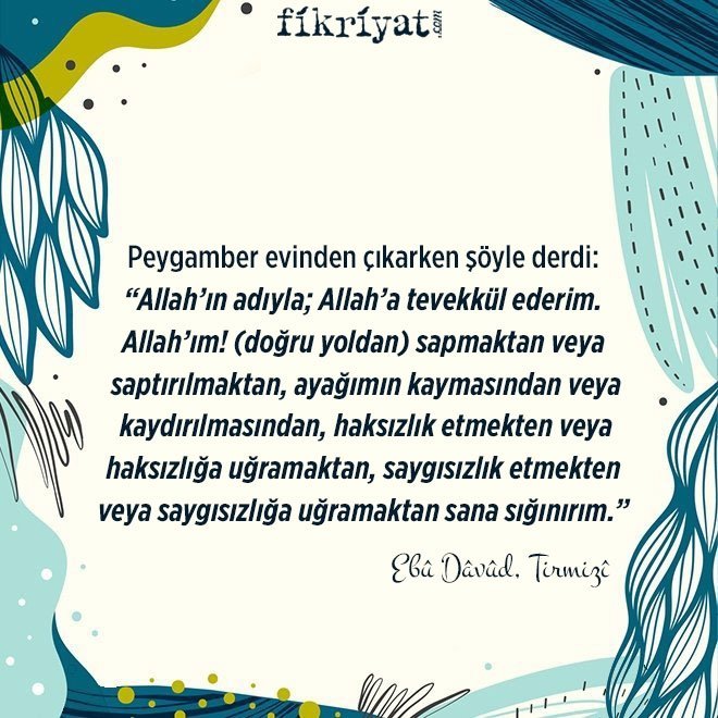 🔸 "Allah'ın adıyla; Allah'a tevekkül ederim. Allah'ım! (doğru yoldan) sapmaktan veya saptırılmaktan, ayağımın kaymasından veya kaydırılmasından, haksızlık etmekten veya haksızlığa uğramaktan, saygısızlık etmekten veya saygısızlığa uğramaktan sana sığınırım."