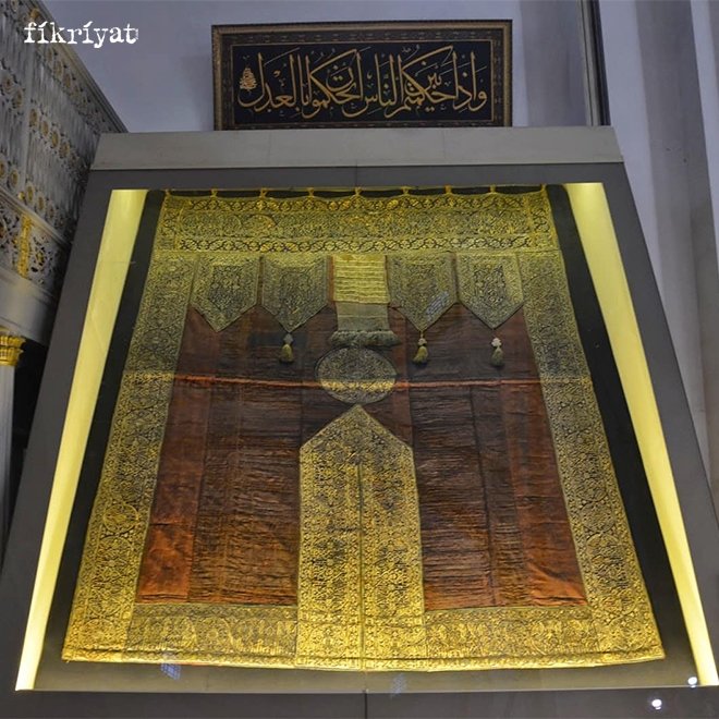 ↪ Günümüzde halen muhafaza edilen bu örtü, zamanında saf altın iplikler ile dokunmuş ve üzerine ayetler işlenmiştir.